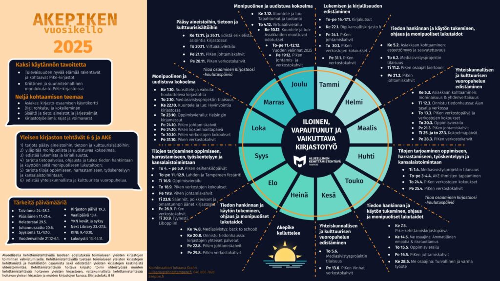 Oppimissisällöt tarjoavat kolmatta vuotta peräkkäin työkaluja kirjaston arkeen, vahvistaen vuonna 2025 kirjastoammattilaisten osaamista PiKe-vision mukaisessa työskentelyssä, asemoiden kirjastohenkilöstön tulevaisuutta ja hyvää elämää rakentavina ja kohtaavina toimijoina kunnissa. PiKe-kirjastoissa toteutuu kriittisen ja suunnitelmallisen monilukutaidon osaamisen kehittämisen projekti, jossa sparrataan kirjastolaisten ammatti-identiteettiä aikuisten mediasivistys- ja monilukutaitotyössä.