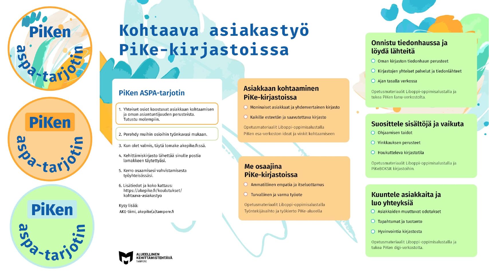 Yhteiset osiot koostuvat asiakkaan kohtaamisen ja oman asiantuntijuuden perusteista, ne tunnistat koulutusartikkeleissa oranssista PiKen aspa-tarjotin -merkistä. Voit perehtyä vihreällä merkillä merkittyihin muihin osioihin työnkuvasi mukaan. Koulutukset järjestetään Teamsissa ja niistä tulee tallenteet Pirkanmaan ja Keski-Suomen alueen Liboppiin. Vuoden 2025 alusta kurssille pääsy edellyttää yleistä kurssiavainta, jonka pääset tilaamaan ohesta. Sama kurssiavain on käytössä kaikilla Liboppi-kursseilla.